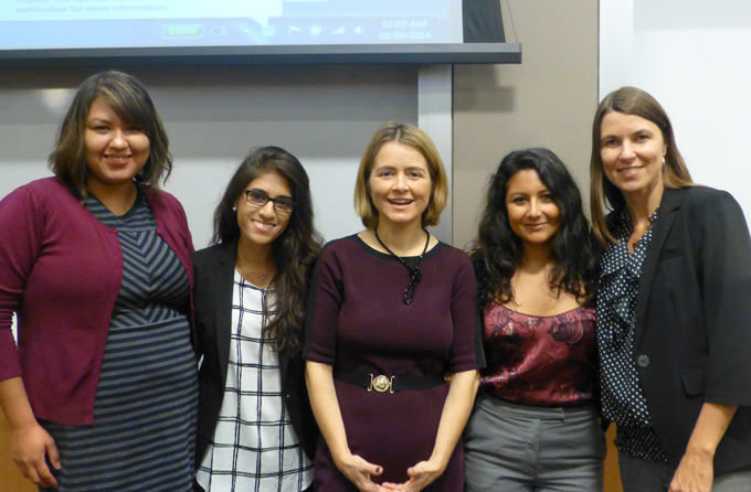 Lupe Aguirre ’16, Neelam Mohammed ’16, UN Special Rapporteur on the human right to safe drinking water and sanitation Catarina De Albuquerque, Leslie Morales ’16, and International Human Rights Law Clinic instructor Allison Davenport ’04