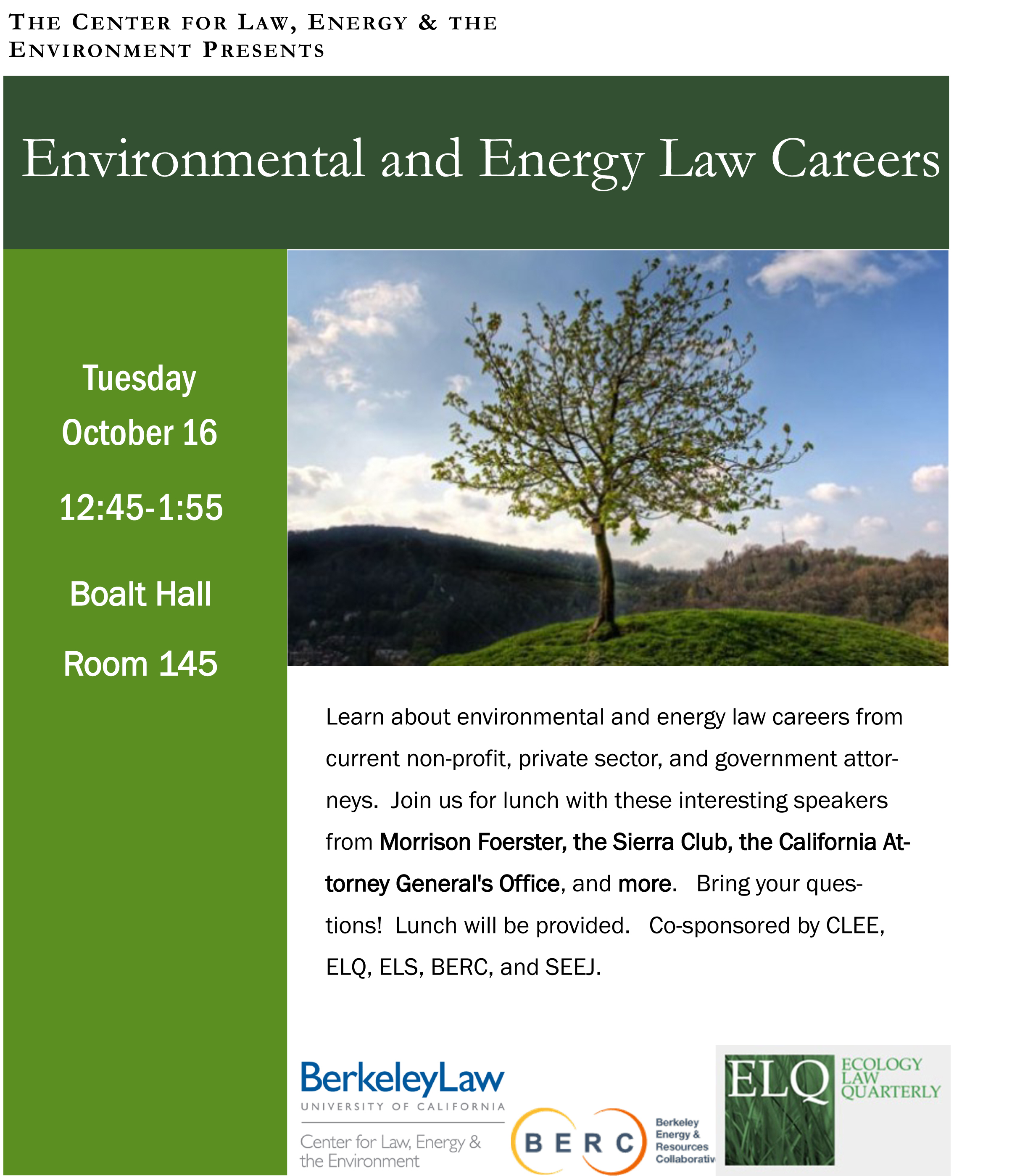 Want to learn more about careers in environmental and energy law? Join us on October 19 to hear from Berkeley Law alumni working at NRDC, PG&E, Shute Mihaly & Weinberger, and San Francisco Baykeeper. This panel is sponsored by the Center for Law, Energy & the Environment (CLEE), working with student groups ELQ, ELS, SALDF, and SEEJ. Lunch will be provided to attendees.