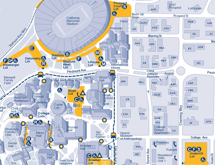 Located up the hill and behind I-House – a short but steep walk. From Piedmont Ave. one block south of International House, turn east on Channing, left on Prospect, and enter the parking lot. Open to the public on weekends and after 5 pm, pay 50 cents per half hour at the yellow pay station. Park in the center or east rows (NOT in the west row).